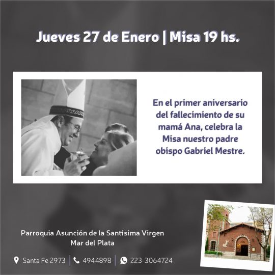 Al cumplirse el Primer Aniversario del fallecimiento de Ana, la mamá de nuestro Obispo Monseñor Gabriel Mestre, el 27 de enero él presidirá la misa en su memoria a realizarse […]