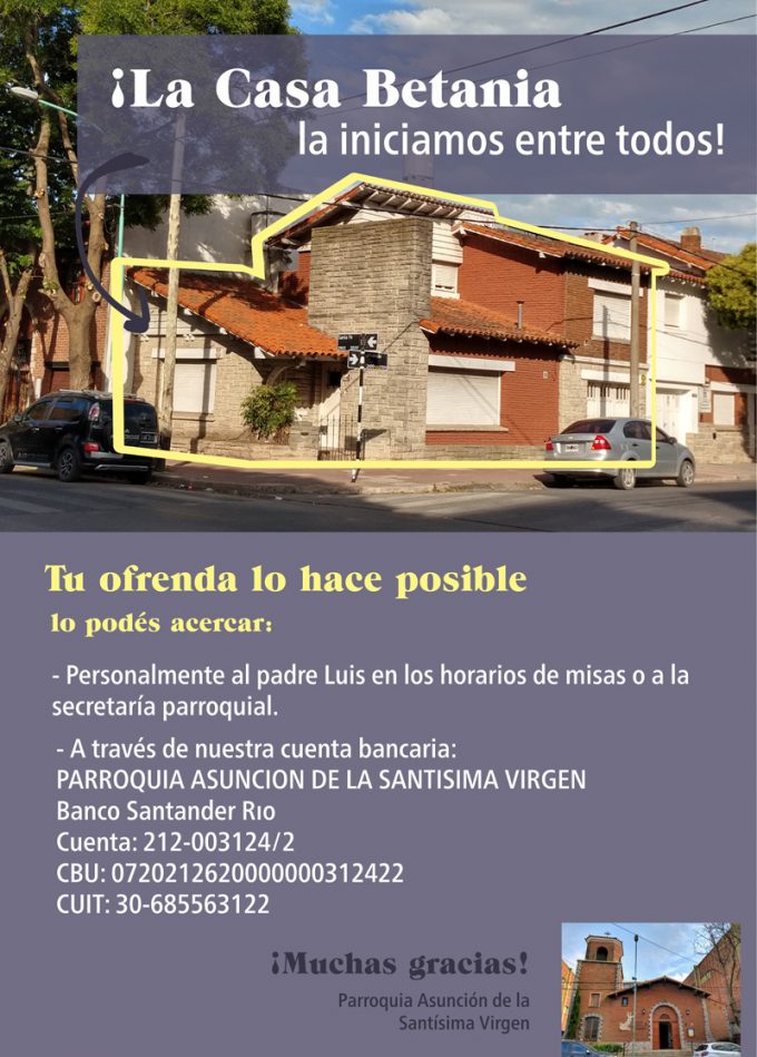 La Parroquia Asunción de la Santísima Virgen pudo adquirir recientemente un nuevo espacio que se llamará CASA BETANIA.