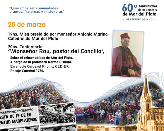p style=text-align: justify;Con motivo del cumpleaños número 60 de la diócesis de Mar del Plata, mañana lunes 20 se realizará una de las actividades que se llevarán cabo para celebrarlo. A las 19 monseñor Antonio Marino obispo de Mar del Plata, presidirá la eucaristía en la Catedral, y a partir de las 20 se realizará la primera charla “Monseñor Rau: pastor del Concilio”, que será en el CEDIER, Pasaje Catedral 1750./p