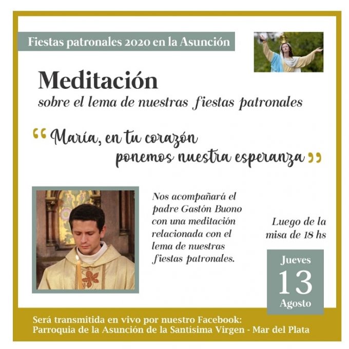 En el marco de las Fiestas Patronales 2020, el jueves 13 de agosto luego de la misa de 18 hs., el P. Gastón Buono brindará una meditación sobre el lema elegido para las patronales de este año: “María, en tu corazón ponemos nuestra esperanza”.