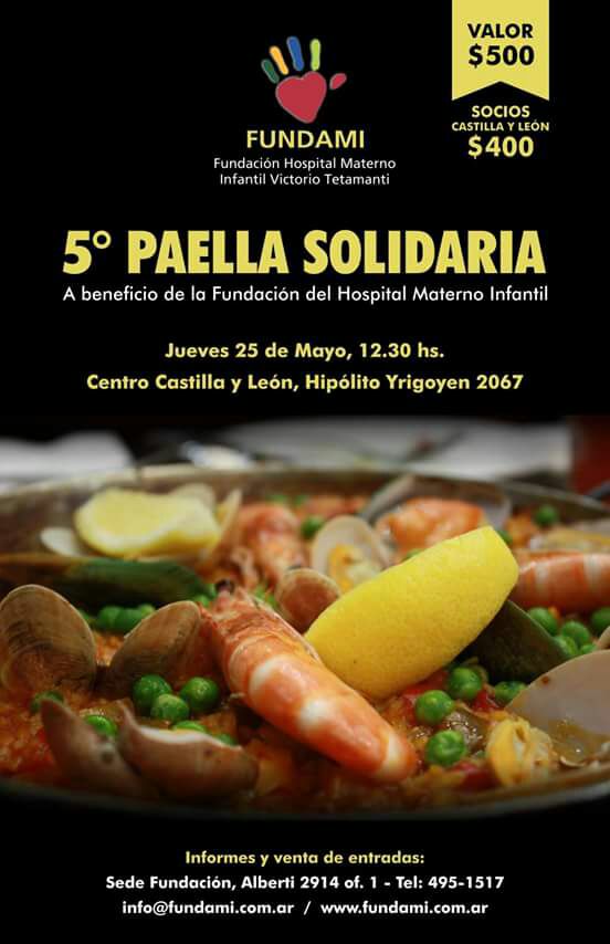 p style=text-align: justify;El jueves 25 de mayo a las 12,30 hs. FUNDAMI te invita a participar de la 5º Paella Solidaria. Con tu entrada colaborás con la Fundación Hospital Materno Infantil que prontamente dará inicio a nuevas obras en el Hospital. Te esperamos en el Centro de Castilla y León para compartir el almuerzo./p